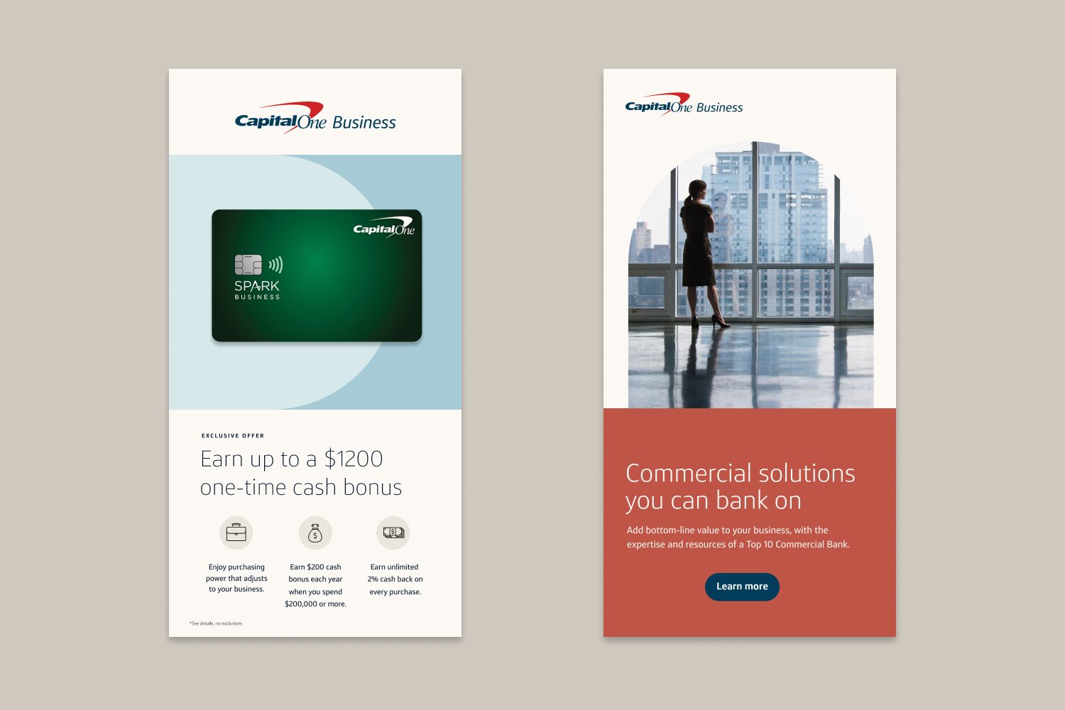 As Capital One reimagined its brand identity, I explored how this refreshed visual direction could elevate marketing for small business products. My work focused on crafting high-end, sophisticated designs that spoke directly to ambitious entrepreneurs and established business owners.